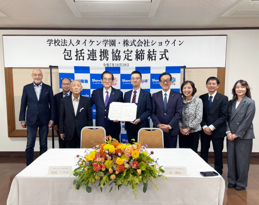 株式会社ショウインは、自社開発のICT教材「AI-Showinシステム」を活用し、生徒が自ら学ぶ力を育む「自立学習」のノウハウを全国の学習塾で展開してきました。一方、学校法人タイケン学園は、スポーツ、医療、福祉、動物、美容、保育、外国語、日本語教育、観光など多岐にわたる分野で、実践的な専門スキルと豊かな人間性を育む教育を強みとしています。